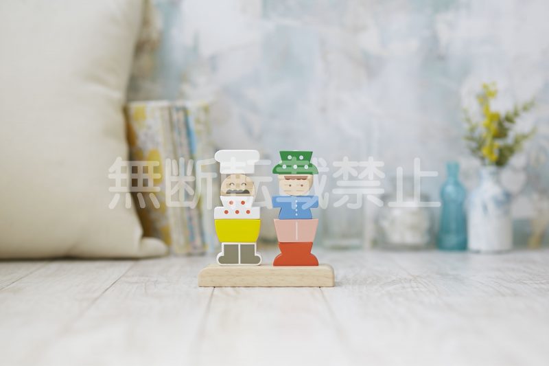 10種類あるブロックを棒に通して、着せ替え遊びができるスタッキントイです。