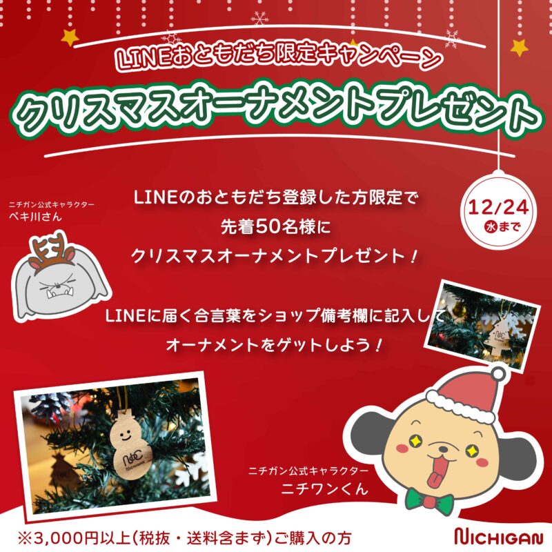 2025年12月24日(水)注文分までの期間限定で、LINEから3,000円以上(税抜・送料含まず)ご購入いただいた方・先着50名様に木のぬくもりが感じられるニチガン特製クリスマスオーナメントを絵柄3種ランダムでプレゼントします♪