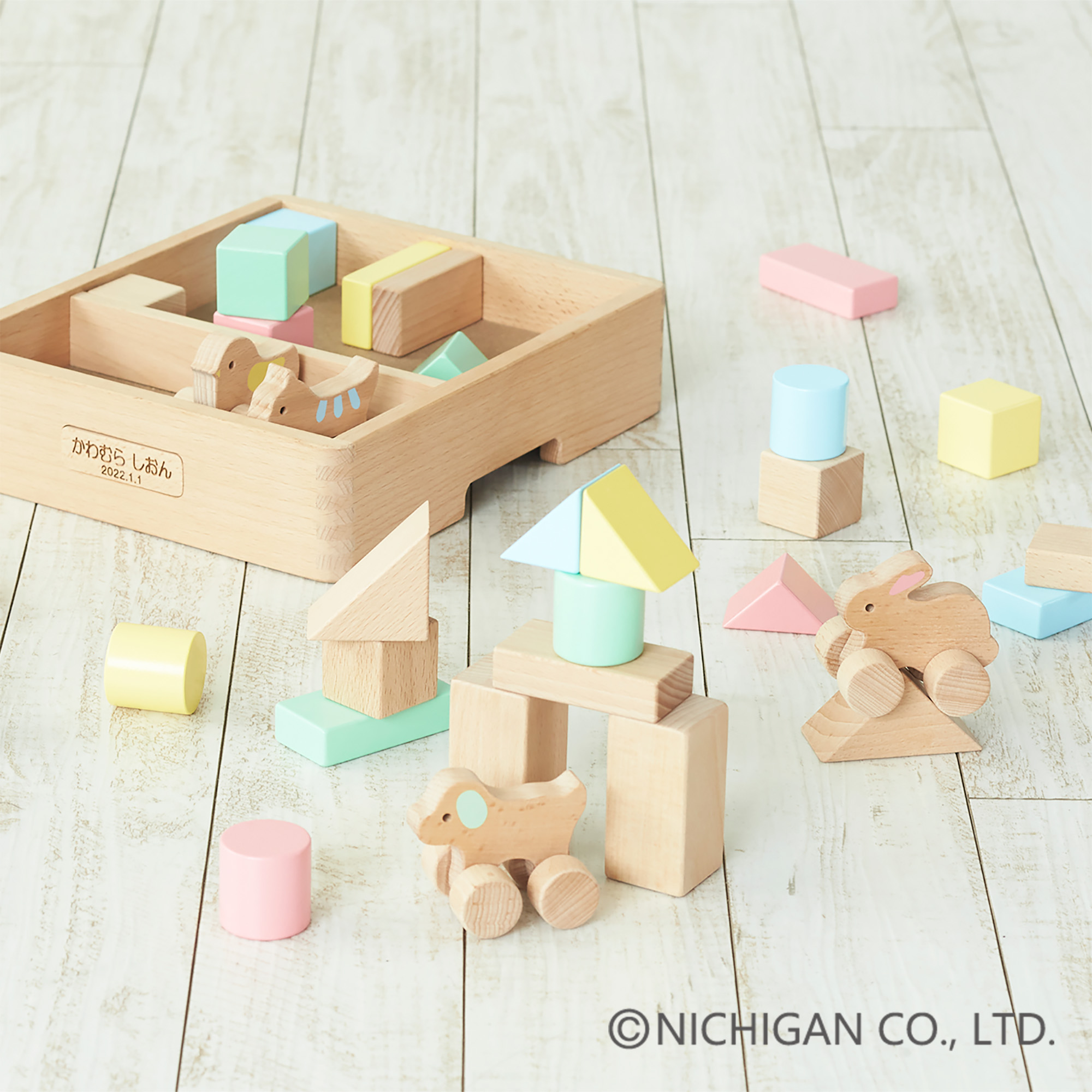 ひよこ、いぬ、ねこ、うさぎのかわいいどうぶつと遊べる、32ピースのつみきのセットです。想像力を働かせて、どうぶつたちのお家や遊び場を、カラフルなつみきでつくることができます。名入れサービスを使って世界で一つのオンリーワンの商品にすることができます。